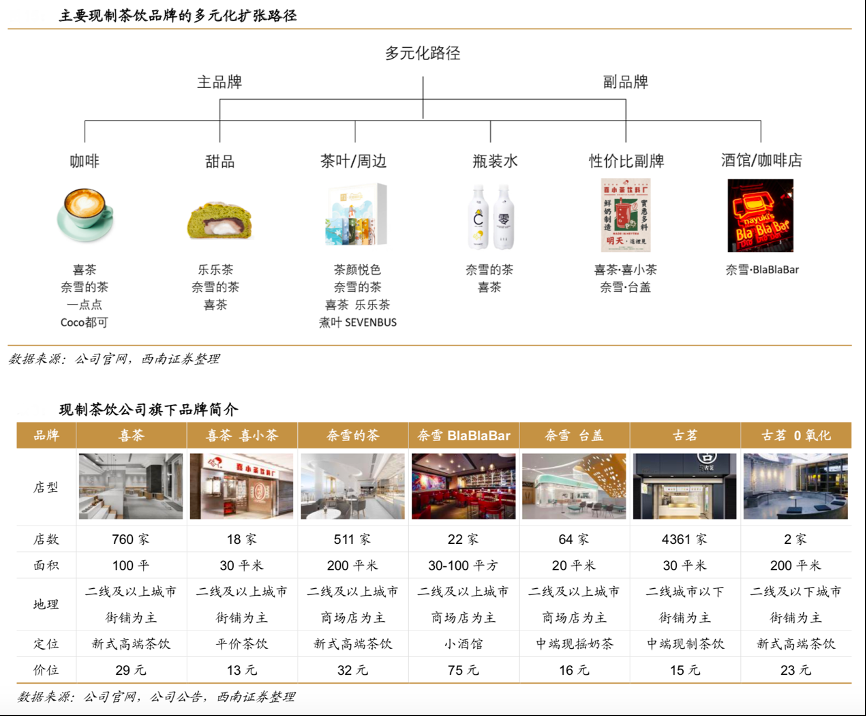 經典案例:根據公司官網、公司公告、西南證券等綜合資訊表明,深耕一線城市的高端網紅品牌對客流、客單量的要求更高,奈雪、喜茶的推新速度在 1-1.2 款/周,除了茶飲相關產品,兩者還在瓶裝水、餐飲副牌的領域試水經營。而小店經營的模式并不適合提供多樣化的SKU,茶顏悅色、蜜雪冰城一年上新款式不到 5 個。