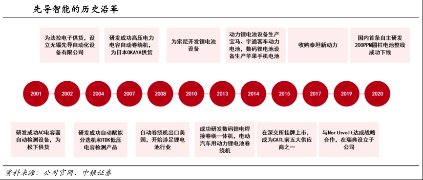 經典案例:根據公司官網、中銀證券等綜合資訊表明,先導智能成立于2002 年,主要業務為鋰電設備、光伏設備、3C 設備、薄膜電容器設備和燃料電池設 備等非標設備。其成立早期以電容設備為主,之后業務重心逐漸轉移至鋰電設備和光伏設備。目前鋰電設備為其核心業務,2019年營收占比為 81.4%。
