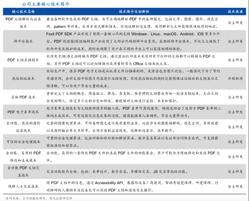 經典案例:根據公司招股說明書、國元證券研究所等綜合資訊表明,福昕軟件的主要核心技術具有跨平臺、性能高、安全以及體積小等優勢,其主要通過 10 余年的技術經驗積累,自主研發取得。目前其已建立起一整套擁有完全自主知識產權的 PDF 技術體系,相關技術在產品應用過程中不斷升級和積累,并運用于公司的主要產品中。