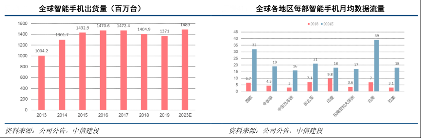 經(jīng)營案例:根據(jù)公司公告、中信建投等綜合資訊表明,安克創(chuàng)新公司秉持“淺海戰(zhàn)略”進行品類選擇,避開競爭激烈、技術(shù)成熟、體量較大的“深海”市場如 PC、平板電腦、電視、智能手機市場,專注深耕市場規(guī)模適中、處于萌芽或成長期、海外市場競爭平緩的細分品類。而智能手機是典型的“深海”市場。據(jù) IDC 數(shù)據(jù),2019 年全球 智能手機出貨量 13.71 億部,預(yù)計到 2023 年將上升至 14.89 億部,呈現(xiàn)在高基數(shù)基礎(chǔ)上繼續(xù)穩(wěn)步發(fā)展態(tài)勢。結(jié)合愛立信統(tǒng)計,全球智能手機用戶月均使用數(shù)據(jù)流量將大幅提升,預(yù)計大部分地區(qū)2018-2024年CAGR在30%以上,全球消費者對移動電子設(shè)備使用依賴度將持續(xù)上升。