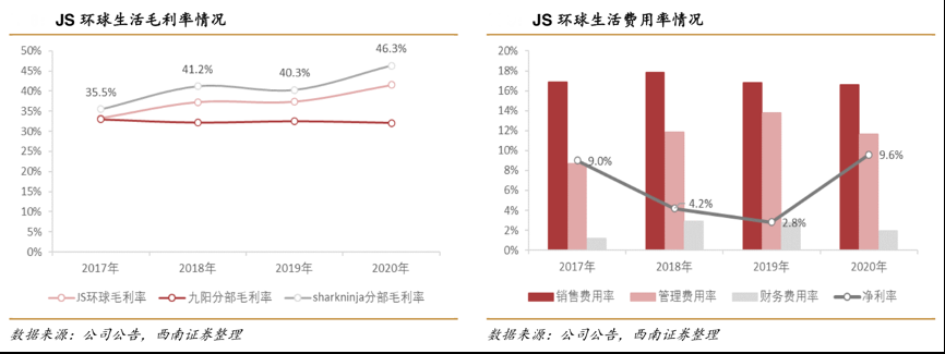 經典案例:根據公司公告、西南證券等綜合資訊表明,得益于 sharkninja 與九陽分部供應鏈的整合,成本端不斷優化,sharkninja 分部毛利率顯著提升。2020 年 sharkninja 毛利率為 46.3%,相較于 2016 年提升了 10.8pp,由此帶動公司整體毛利率提升了 9.6pp 至 41.5%。費用率方面,由于收購整合以及上市等帶來了較多的非經常性費用支出,2017-2018 年JS環球生活公司期間費用率略有提升。