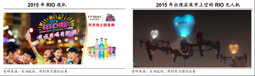 經(jīng)典案例:根據(jù)百潤股份、野村東方國際證券等綜合資訊表明,2015 年的 RIO 廣告中更為重點突出夜間飲用、party 飲用的概念,如在 2015 年 7 月時 RIO 打出廣告標語“RIO 夜趴”,以及其在 2015 年 8 月時通過在夜市上空投放無人機,更強化了其夜間派對飲用的標簽。