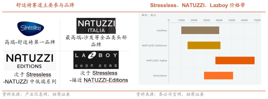 經典案例:根據產業信息網、各公司官網、招商證券等綜合資訊表明,Stressless 主打高端舒適椅第一品牌,價格帶在 2800-5100 美元,全球市場上從市場售價及定位看,相似的競爭品牌有 NATUZZI、Lazboy。而NATUZZI-Italia 定位最高端,是沙發等全品類的頭部品牌,價格帶最高,在 3700-6800 美元,定價比 Stressless 高 25~30%,但NATUZZI 品牌產品品類更加豐富,最開始做沙發品類起家,在舒適椅領域積累不及 Stressless。Lazboy 單椅品類較為突出,品牌定位及價格接近 NATUZZI-Editions,價格帶在 1000-4000 美元之間。