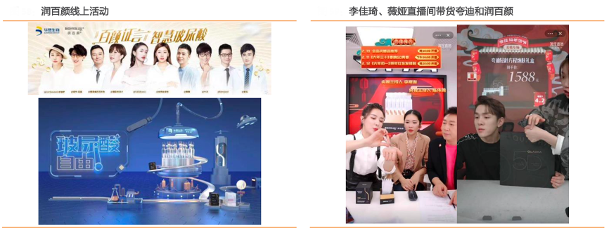 經典案例:根據潤百顏微信公眾號、淘寶直播間、天風證券研究所等綜合資訊表明,潤百顏與夸迪是華熙主推的兩大品牌,次拋原液為主推的大單品,以大品牌+大單品的模式帶動其余品牌及單品的銷售。從淘寶數據看,潤百顏與夸迪的銷售額持續高速增長,次拋原液等大單品表現突出。其已積極擁抱多種渠 道,如線上的 KOL 的直播帶貨、線下對臨床醫生和患者進行學術研討、培訓等方式。在品類端總體采用大單品帶動小單品的形式,積極推進品牌力的建設。