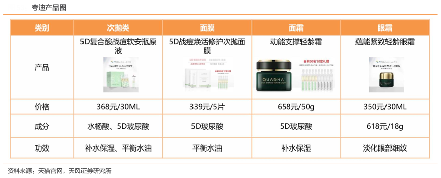 經典案例:根據天貓官網、天風證券研究所等綜合資訊表明,夸迪主打 5D 玻尿酸,爆款星品 5D 玻尿酸戰痘次拋原液、5D 煥顏精粹次拋精華原液和 5D 極光勻凈亮膚次拋原液等,產品類別涉及潔面、面膜、爽膚水等多個品類,并針對溫和清 潔、補水保濕、控油滋養等功效進行分類。