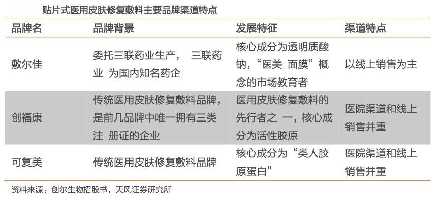 經典案例:根據創爾生物招股書、天風證券研究所等綜合資訊表明,貼片式醫用皮膚修復敷料銷售渠道以線上為主。主要品牌中敷爾佳以線上銷售為主,創福康和可復美渠道和線上銷售并重發展。