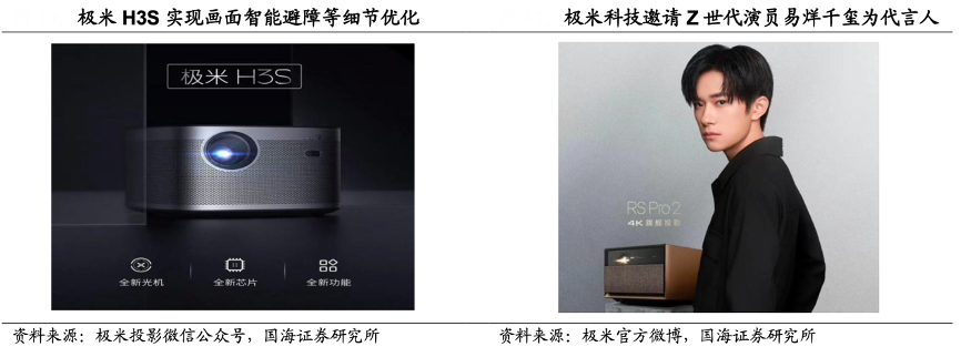 經典案例:根據極米投影微信公眾號、極米官方微博、國海證券研究所等綜合資訊表明,極米引領行業實現投影由手動調焦到自動調焦,再到全自動調焦的轉變,現階段注重光學引擎、無感知、幕布對齊、自動避障等細節宣傳,新品多領先于同類公司發布,在注重科技感的 Z 世代心中具有先發優勢;同時其邀請新生代演員易烊千璽進行代言,陽光外形與極米投影儀高顏值相得益彰,實力派演技與極米技術優勢不謀而合,為 Z 世代傳遞滿滿正能量。