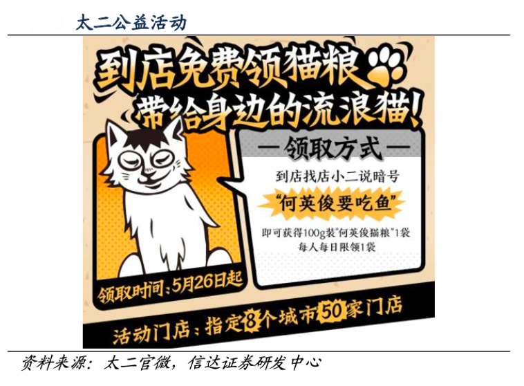 經(jīng)典案例:根據(jù)太二官微、信達(dá)證券研發(fā)中心等綜合資訊表明,太二公司通過(guò)定期的會(huì)員活動(dòng)其私域流量進(jìn)行運(yùn)營(yíng),例如通過(guò)“何英俊公益”救助流浪貓,顧客可以通過(guò)店鋪會(huì)員積分換取公益貓糧,吸引眾多粉絲參加,深化品牌形象。根據(jù)其公眾號(hào)數(shù)據(jù),截至 2022 年 1 月 9 日,何英俊貓糧已累計(jì)領(lǐng)取 3.6 萬(wàn)袋,累計(jì)向各類公益機(jī)構(gòu)捐贈(zèng) 8.9 噸貓糧。