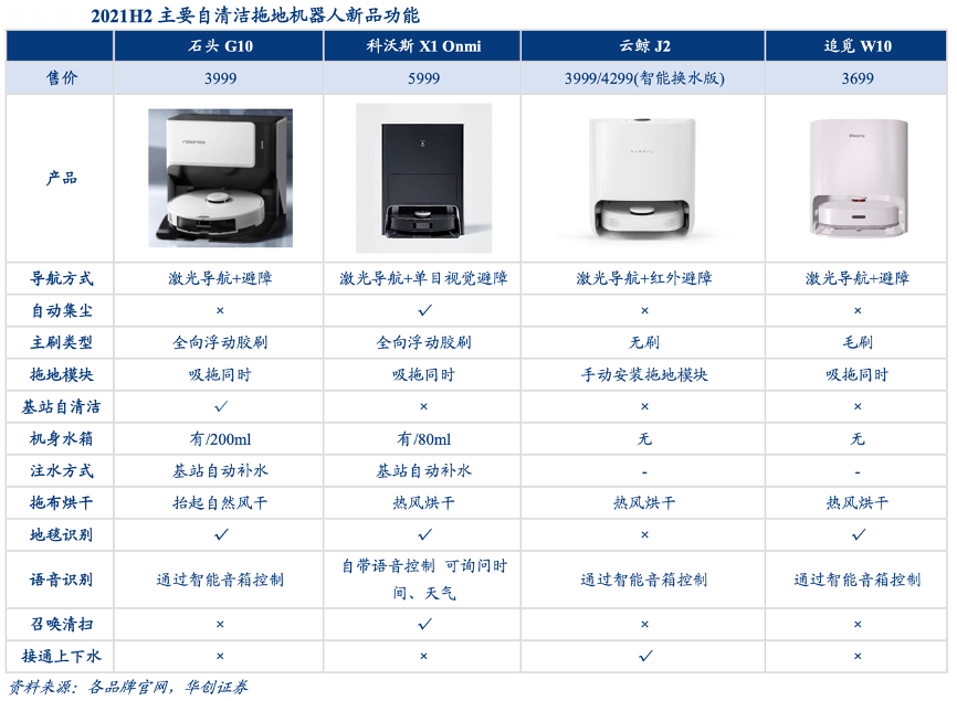 經(jīng)典案例:根據(jù)各品牌官網(wǎng)、華創(chuàng)證券等綜合資訊表明,國內(nèi)首個自清潔拖地機(jī)器人由 2019 年末云鯨首次推出,而彼時產(chǎn)品初步成型,在功能方面尚有較 多改進(jìn)空間,例如掃拖模塊需要手動安裝切換、機(jī)身沒有自帶水箱潤濕拖布需要頻繁回洗等。在2021年,隨著科沃斯、石頭科技等龍頭品牌進(jìn)入此賽道后,增加機(jī)身水箱自動注水、自動集塵、自動烘干拖布等功能后,技術(shù)迭代有所放緩,產(chǎn)品形態(tài)逐步穩(wěn)定。