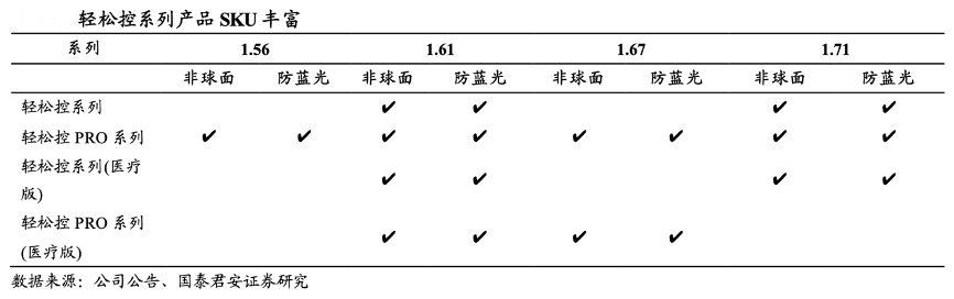 經典案例:根據公司公告、國泰君安證券研究等綜合資訊表明,明月鏡片公司截至目前零售渠道共有 12 個 SKU,醫療渠道共有 8 個 SKU,公司在近視管理鏡片品類已有合計 20 個 SKU 同時在售,在產品線豐富度方面繼續保持明顯領先。