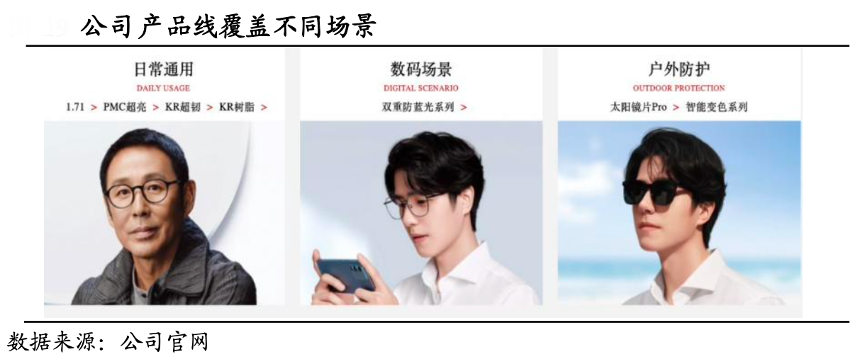 經典案例:根據公司官網、國泰君安證券研究等綜合資訊表明,明月鏡片公司自主研發設計鏡片光學結構、膜層結構,產品系列覆蓋滿足日常生活需求的通用型鏡片、針對不同人群及多元使用場景的功能性鏡片,如長時間使用電子屏幕人群可以選擇明月獨家雙重防藍光系列、喜歡透光性更強“水晶”般透亮不反光的可以選擇 PMC 超亮系列,追求輕薄鏡片體驗人群可選擇折射率 1.71 系列以及適合戶外防護的近視太陽鏡片 Pro 系列,還有 KR 超韌、智能變色、漸進多焦點等品類的鏡片。