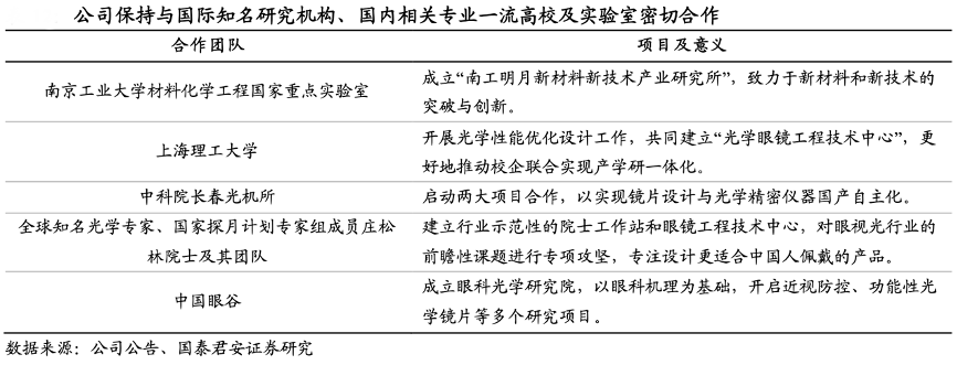 經(jīng)典案例:根據(jù)公司公告、國(guó)泰君安證券研究等綜合資訊表明,明月鏡片公司重視技術(shù)及產(chǎn)品的研發(fā),設(shè)立研發(fā)中心并制定一套完整的研發(fā)業(yè)務(wù)流程及科研項(xiàng)目管理流程,組建一支技術(shù)水平過硬、行業(yè)經(jīng)驗(yàn)豐富的技術(shù)研發(fā)團(tuán)隊(duì)。為研發(fā)更符合中國(guó)人眼球結(jié)構(gòu)和用眼習(xí)慣的產(chǎn)品,公司長(zhǎng)期保持與國(guó)際知名研究機(jī)構(gòu)、國(guó)內(nèi)相關(guān)專業(yè)一流高校及實(shí)驗(yàn)室密切合作。