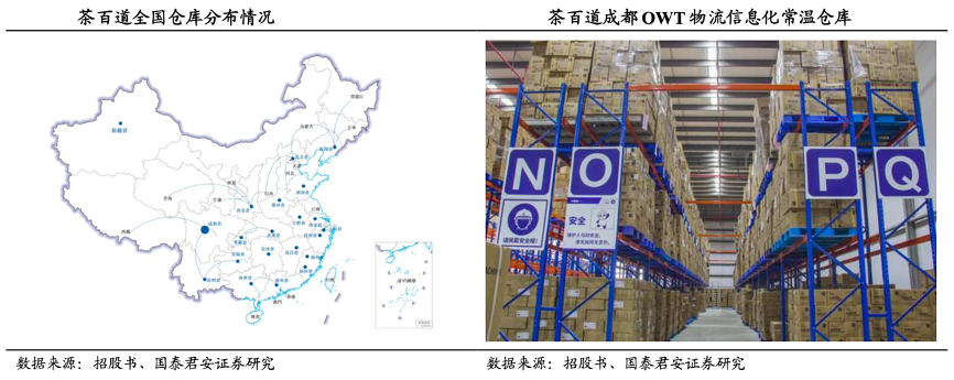 經(jīng)典案例:根據(jù)招股書、國泰君安證券研究等綜合資訊表明,截至 2023 年 12 月 31 日,茶百道公司綜合性冷鏈倉儲及配送網(wǎng)絡(luò)包括 21 個多溫倉庫,由 20 個中心倉及 1 個前置倉組成,覆蓋面積約 80,000 平方米。公司實施訂單管理 (OMS)、倉儲管理及運輸管理(OWT)系統(tǒng),調(diào)度一支由大約 300 輛來自第三方移動服務(wù)提供商的多溫運輸車輛組成的車隊,每天能夠向數(shù)千家門店運送新鮮材料,為約 92%的茶百道門店提供每周兩次或以上的配送服務(wù)。