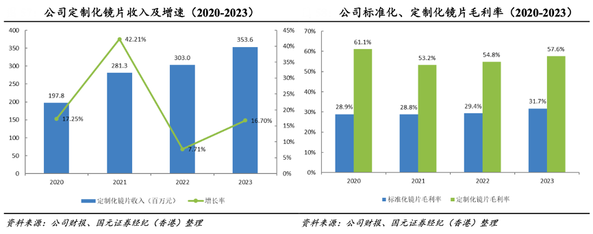 經典案例:根據公司財報、國元證券經紀(香港)等綜合資訊表明,康耐特光學公司的定制化鏡片是依據消費者的不同要求而為“量身定制”的產品。以公司為高度近視人群定制的帽仔片產品為例,其采用縮小鏡片直徑原理,在保證屈光度的前提下,最大可能的減小了鏡片的厚度和重量。2023 年,公司定制化鏡片收入為 3.54 億元,同比增長 16.3%,占收入比例約為 20.1%,公司定制化鏡片收入占比逐步提升。