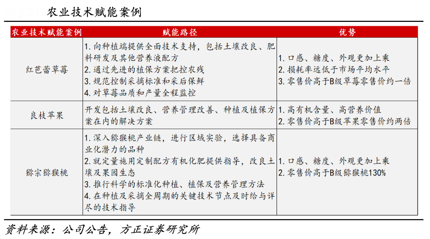經典案例:根據公司公告、方正證券研究所等綜合資訊表明,百果園通過向合作的種植基地推廣種植理念和種植與采后技術,幫助種植基地培育優質果品,提升產量。
