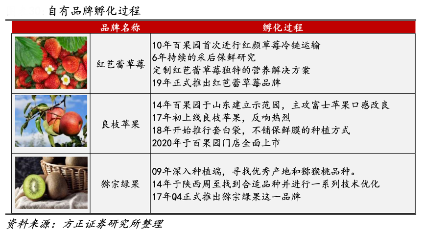 經典案例:根據方正證券研究等綜合資訊表明,百果園多年行業深耕經驗助力品牌孵化。以紅芭蕾草莓、良枝蘋果、獼宗綠果為例,這三款自有品牌招牌果在全面上市之前都經歷多年培育、調整、優化,紅芭蕾歷時九年,良枝蘋果歷時六年,獼宗綠果歷時八年。