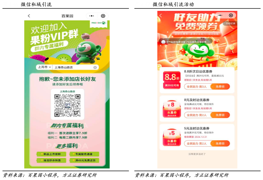 經典案例:根據百果園小程序、方正證券研究等綜合資訊表明,百果園推出了“到店自提”的運營模式以實現線上線下的流量循環。用戶從 各個觸點接觸到“到店自提”的優惠活動,并下單購買。在用戶到店后,門 店工作人員會主動拋出“買水果送回頭券”、“99 元入會”、“進群搶福利” 等優惠活動,引導用戶添加企微好友。最后,引導用戶進群,進行欄目化、精細化管理,讓用戶能夠第一時間了解最新產品優惠,促使用戶決策、購買。