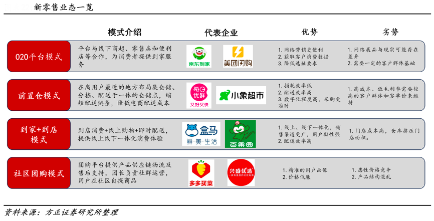 經(jīng)典案例:根據(jù)方正證券研究所等綜合資訊表明,隨著新零售業(yè)態(tài)的不斷發(fā)展,目前主要有以下四種新零售業(yè)態(tài):以京東到家、美團閃購為代表的 O2O 平臺模式,以每日優(yōu)鮮、小象超市為代表的前置倉模式,以盒馬生鮮和百果園為代表的到家+到店模式與以多多買菜和興盛優(yōu)選為代表的社區(qū)團購模式,四種模式各有優(yōu)劣,目前零售行業(yè)呈現(xiàn)多種模式共存的現(xiàn)象。