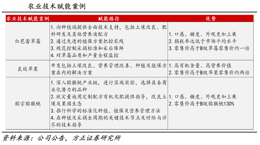 經(jīng)典案例:根據(jù)公司公告、方正證券研究所等綜合資訊表明,百果園通過向合作的種植基地推廣種植理念和種植與采后技術(shù),幫助種植基地培育優(yōu)質(zhì)果品,提升產(chǎn)量。