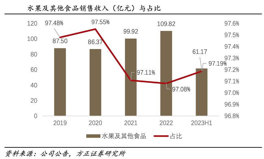 經(jīng)典案例:根據(jù)公司公告、方正證券研究所等綜合資訊表明,百果園公司的產(chǎn)品銷售以水果及其他食品為主。2019 年到 2023 年 H1 水果及其他食品 的銷售收入占比達(dá)到 97%以上,百果園擁有業(yè)內(nèi)獨(dú)特的四級(jí)果品品質(zhì)分級(jí)體系,招牌果與 A 級(jí)的高端水果的銷售占比逐年穩(wěn)步提升,至 2023 年 H1 招牌果和 A 級(jí) 果銷售收入占比之和達(dá)到 67%。