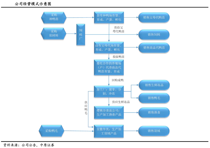 經典案例:根據公司公告、中原證券等綜合資訊表明,華英農業在成鴨屠宰環節,其總部加工廠按照約定回購合作的養殖場(戶)育成的合格商品成鴨,經屠宰加工制成凍品及生鮮制品。凍品及生鮮制品一部分自用,做熟食生產原料;另一部分通過經銷商或直接銷往終端客戶。同時,公司擁有中亞、東南亞、中東、香港等多個國家及地區凍品制品的出口資格,根據市場行情向境外客戶直接銷售。