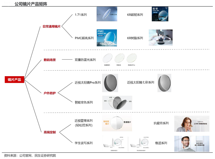 經典案例:根據公司招股書、沙利文、民生證券研究院等綜合資訊表明,明月鏡片公司目前鏡片產品主要包含日常通用鏡片和功能性鏡片兩大類。功能性鏡片根據應用場景和人群特點不同,通過調整鏡片基礎材料、光學設計或鏡片膜層使得鏡片擁有一種或多種功能特性,目前公司功能性鏡片產品包含近視管理、PMC 超亮、KR 超 韌、雙重防藍光、智能變色、偏光、漸進多焦點等。