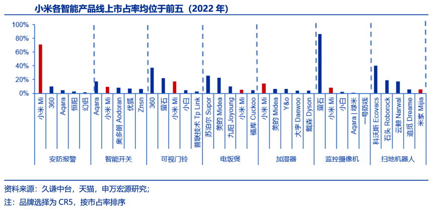經(jīng)典案例:根據(jù)久謙中臺、天貓、申萬宏源研究等綜合資訊表明,在低價高性價比的道路上,小米獨樹一幟采用緊貼成本定價的商業(yè)模式,與同業(yè)比較,小米系產(chǎn)品價格顯著較低,空調(diào)、空凈器等線上主要品類市占率均位于前五,均價則顯著低于其他品類,以高性價比滲透市場,分得高份額。