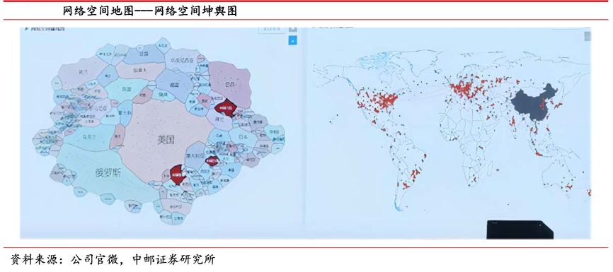 經典案例:根據公司官微、中郵證券研究所等綜合資訊表明,2022 年 9 月,盛邦安全發布并展示了首個網絡空間地圖——網絡空間坤輿圖,為新基建 提供數字安全底圖。網絡空間坤輿圖,融合了盛邦安全在網絡測繪、大數據分析、可視化等多 個交叉領域的多年技術積累,通過主被動結合的探測手段,對網絡空間環境進行“態”與“勢” 的多維度描繪,實現了網絡空間與地理空間的關聯與映射。