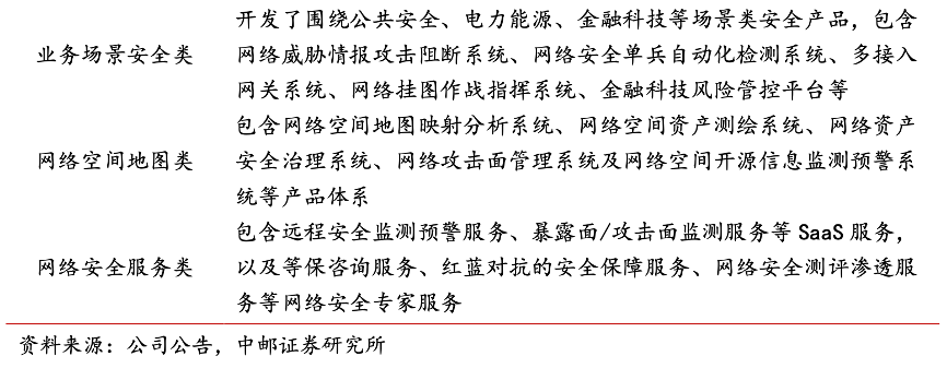 經典案例:根據公司公告、中郵證券研究所等綜合資訊表明,盛邦安全為客戶提供網絡安全基礎類、業務場景安全類、網絡空間地圖類安全產品及服 務。公司研發的網絡安全產品種類繁多,包括防火墻、入侵檢測與防御、安全網關、安全管理 系統等,這些產品具有良好的安全性能和穩定性,能夠滿足不同客戶對網絡安全的需求。