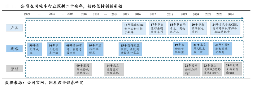 經典案例:根據公司官網、國泰君安證券研究等綜合資訊表明,2015年愛瑪科技公司出口 國際市場并獲得歐盟認證,2021年在 A 股上市,2022 年全年銷量突破 1000 萬輛,并于 2023 年登上《乘風 2023》等熱門綜藝。公司緊緊圍繞“用戶至上、卓越產品、精耕市場、精細運營”的戰略主軸和向數智化科技公司轉型的戰略方向,持續專注于電動兩輪車研發與生產。