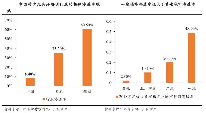 產業細化化、人群再開發成為在線少兒英語教育企業增長的巨大驅動力,下沉市場成為業績增長的“戰略增長地”。根據弗若斯特沙利文、比達咨詢、廣證恒生等綜合資訊表明,一線城市的滲透率整體接近 48.9%,預二線城市滲透率為 20.00%, 三、四線城市為 10.00%左右,整體增量市場空間較大。三四線城市及以下區域在線英語教育的增強。