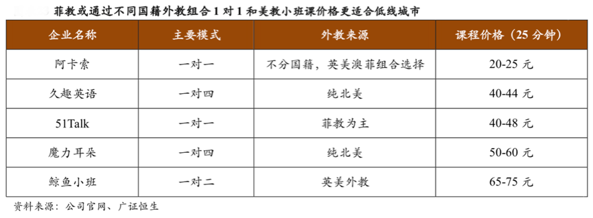“下沉市場”在線英語教育市場再開發,是企業業績再增長的一大動力,更是企業在線英語教育再發展的“戰略性舉措”。下沉市場拓展,創新經營策劃是必要的,根據各公司官網、廣證恒生等綜合資訊表明,以菲教或通過不同國籍外教組合1對1和美教小班課價格更適合低線城市,其擁有強大的外教資源及小班教育優勢,強化產品特色,提升產品的高效組合,強化外教高性價比資源組合,在線英語教育企業的下沉市場拓展,定可大有斬獲。