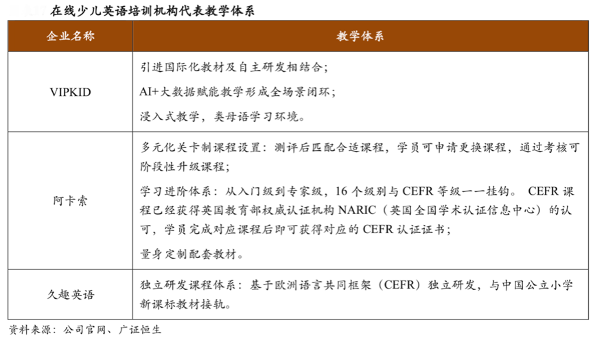 身處數字化技術驅動的時代,在線少兒英語教育企業的數字品牌策劃營銷經營,需要強化以“學員全域教育消費體驗”為核心,強化在線小班教學、線下閱讀訓練、沙龍互動教育會等全渠道營銷策劃活動及教學服務,根據國際標準和國內實際情況打造進階式科學課程體系和多樣性全能專題課程。根據各公司官網、廣證恒生等綜合資訊表明,國內在線少兒英語培訓機構的教學體系相對集中,各企業依靠教材體系、研發優勢、與國外結構合作特色等,引入大數據評定及AI資源等,全面亮化在線英語互動價值及學習進階機制,商業模式趨同,經營手法趨同,真正的商業模式創新在即。