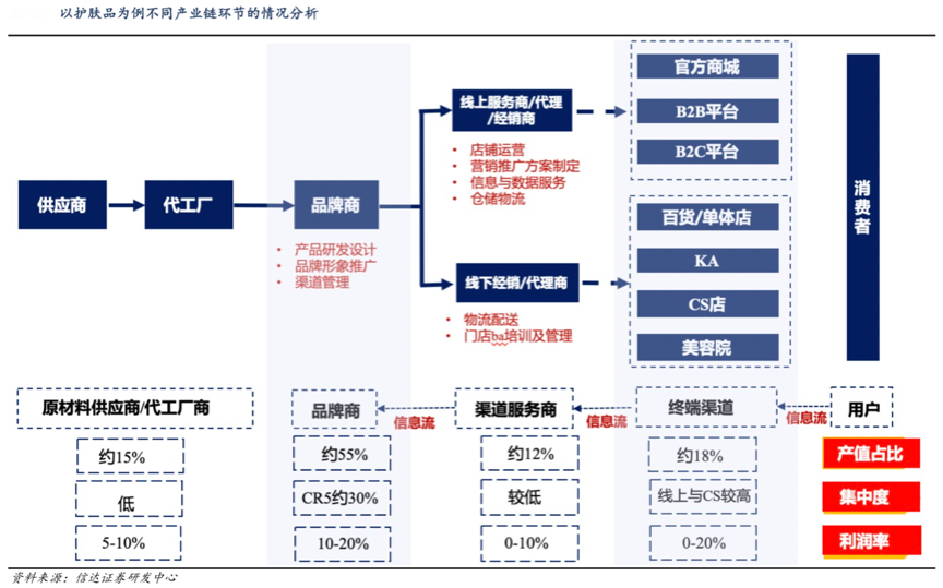 美容化妝品行業的產業勃興與“產業運營效率”密切相關,高效的渠道分銷、集成式的美容化妝品牌策劃設計及集合式產品供應鏈建設等推動著美容化妝品產業鏈的高效運營。根據信達證券研發中心等綜合資訊表明,以護膚品為例不同產業鏈環節擁有不同產業價值,以品牌商、渠道服務商等為代表的“品牌經營環節”在產業鏈經營中占據有利競爭地位,毛利率分配更多集中在品牌商(約55%)、終端渠道(約18%)層面,也是極具產業價值的層面。
