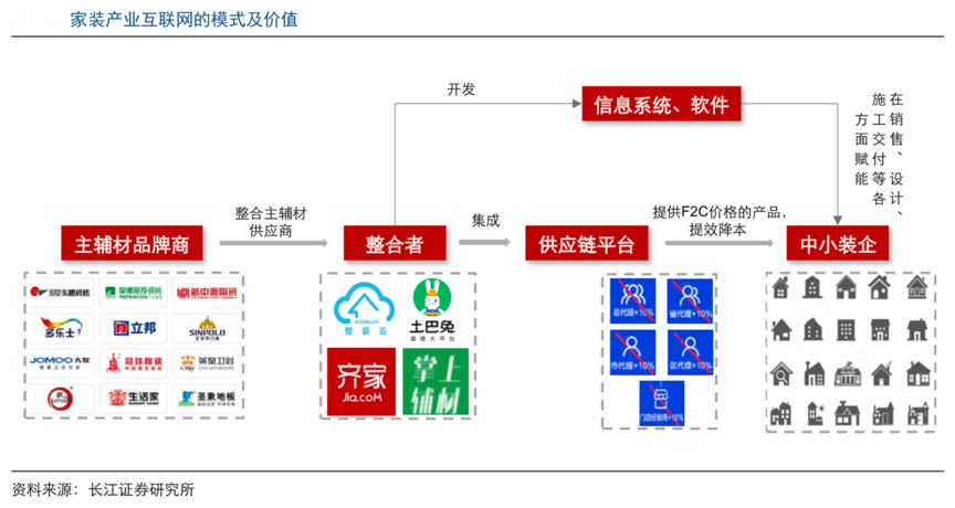 經典案例:根據長江證券研究所等綜合資訊表明,家裝產業互聯網平臺的核心是做供應鏈的整合,提升家裝產業供應鏈的效率、降低成本。其重在利用技術優勢打通銷售、生產、運輸、施工交付等全產業鏈環節,實現各環節的互通互聯,通過一些軟件的使用,解決中小裝企在引流獲客、設計、施工交付等方面的痛點,提升其競爭力。近年來,出現了一批家裝行業產業互聯網平臺,如小胖熊、掌上輔材以及 HOMKOO 整裝云等。