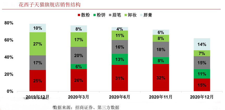 經(jīng)典案例:從第三方數(shù)據(jù)、招商證券等綜合資訊表明,花西子依靠差異化定位的散粉打開了品牌知名度后,通過“百鳥朝鳳修容盤”拉高了品牌定位,拓寬了受眾人群,隨后粉餅、眉筆、唇膏迅速被市場接受,實現(xiàn)了品類擴充。通過天貓店鋪可以看到,2019年12月公司核心類目散粉、粉餅、眉筆、卸妝濕巾、唇膏銷售額占比高達80%,但到了2020年12月這五大類目銷售額占比降至60%,特別是散粉已經(jīng)降至15%,說明擴品類已經(jīng)初步達成。