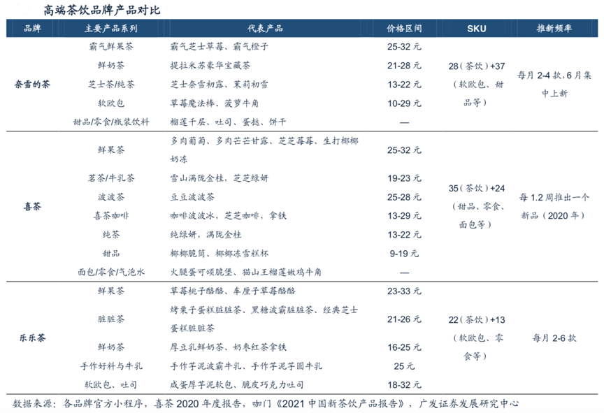 經(jīng)典案例:根據(jù)各品牌官方小程序、喜茶2020年度報告、咖門《2021中國新茶飲產(chǎn)品報告》、廣發(fā)證券發(fā)展研究中心等綜合資訊表明,從消費者評價來看,高端茶飲品牌從口味、環(huán)境、服務(wù)三個維度消費者評價顯著高于中端和大眾品牌。目前喜茶、奈雪的茶、樂樂茶SKU都在30款左右,主要產(chǎn)品系列重疊度較高,大致可以分為果茶、鮮奶茶、純茶、其他(咖啡、軟歐包、甜點、冰淇淋等),形成了以經(jīng)典爆款單品+定期上新+跨界聯(lián)名為主的產(chǎn)品形態(tài),經(jīng)典爆款單品是銷量基礎(chǔ),定期上新和跨界嘗試吸引復購+保持品牌熱度。