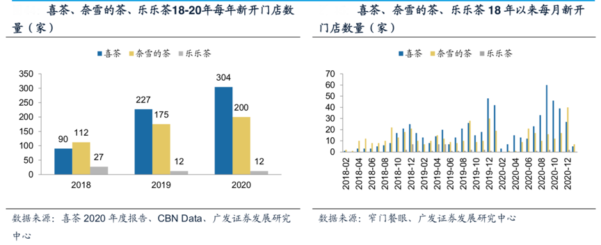 經典案例:根據喜茶2020年度報告、CBN Data、窄門餐眼、廣發證券發展研究中心等綜合資訊表明,在經歷了2015-17年新式茶飲消費者教育的階段后,喜茶和奈雪的茶迅速完成品牌認知和忠誠度的積累,在資本助力下開啟了快速開店的階段,2018年-20年喜茶新開門店90 家、227家、304家,截止21年1月,奈雪的茶在全國 共有513家門店。