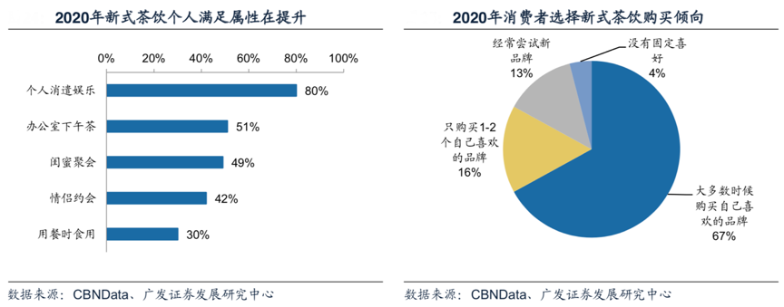 經典案例:根據CBNData、廣發證券發展研究中心等綜合資訊表明,根據大眾點評2019年數據,在不同餐飲品類中,飲品店點評熱度僅次于火鍋。根據CBNData,2020年消費者偏好的消費場景中,個人消遣娛樂達到 80%,茶飲的個人消費屬性有所強化。此外下午茶、閨蜜聚會、情侶約會、用餐也是茶飲消費的主要場景。消費者對品牌忠誠度在不斷提升,2020年大多數時候購買 自己喜歡的品牌的消費者占67%,只購買自己喜歡的1-2個品牌的消費者占16%。