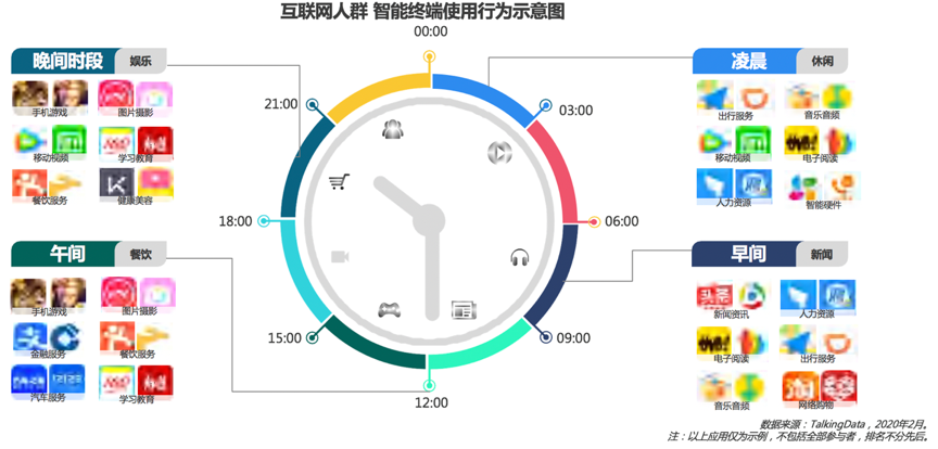 根據(jù)TalkingData等綜合資訊表明,互聯(lián)網(wǎng)人群智能終端使用已經(jīng)“全天侯”了,各類別應(yīng)用已經(jīng)滲入到人們生活的方方面面,休閑、新聞、餐飲、娛樂等應(yīng)用24小時影響著人們的消費行為,圖片攝影、手機游戲、餐飲服務(wù)、學(xué)習(xí)教育類等應(yīng)用早晚活躍差距較大,“午休”和“晚間黃金時段”成為用戶經(jīng)營的核心時間段。