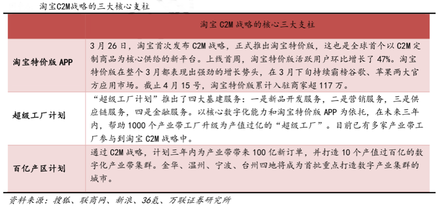 C2M的商業創新推進需要構筑強大的“產業鏈”,搶占品牌設計創新點,創新數字品牌營銷策劃經營,建立消費端、生產端、服務端、技術端等多端集成共進。根據搜狐風、聯商網、新浪 、36氪、萬聯證券研究所等綜合資訊表明, 2019年3月,阿里重啟聚劃算,與天天特賣整合,包括產地直供、C2M定制等,至此,阿里已基本完成C2M戰略雛形布置。2019年12月,淘寶事業群成立C2M事業部;2020年3月,淘寶正式發布C2M戰略,以淘寶特價版,“百億產區計劃”和“超級工廠計劃”為三大核心支柱。