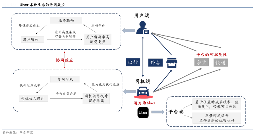 經(jīng)典案例:根據(jù)華泰研究等綜合資訊表明,相比于其競(jìng)爭(zhēng)對(duì)手 Doordash(外賣(mài))和 Lyft(出行)等僅從事一項(xiàng)業(yè)務(wù),Uber 以移動(dòng)運(yùn)力網(wǎng)絡(luò)的復(fù)用為基礎(chǔ),將外賣(mài)和出行業(yè)務(wù)整合,在司機(jī)端、用戶(hù)端和平臺(tái)端均帶來(lái)了更強(qiáng)的協(xié)同效應(yīng)。