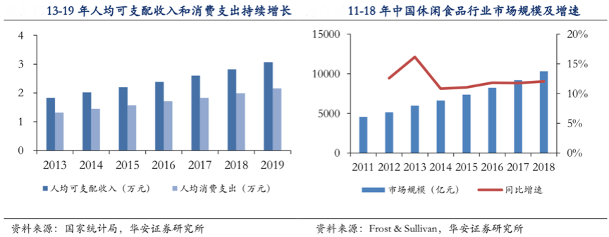 經(jīng)典案例:根據(jù)國(guó)家統(tǒng)計(jì)局、華安證券研究所等綜合數(shù)據(jù)顯示,2013-2019年我國(guó)人均可支配收和消費(fèi)支出持續(xù)增長(zhǎng),同時(shí)根據(jù)Frpst&Sullivan、華安證券研究所等綜合資訊表示,2011年-2018年中國(guó)休閑食品行業(yè)市場(chǎng)規(guī)模持續(xù)擴(kuò)大,品類極具增長(zhǎng)空間。