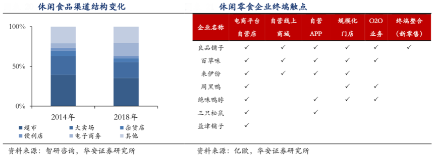 經(jīng)典案例:根據(jù)智研咨詢、華安證券研究所等綜合資訊表明,2014年-2018年休閑食品渠道結(jié)構(gòu)中超市占比從39%降為 35%,電子商務(wù)占比從 6%增長(zhǎng)至 17%,消費(fèi)者忠誠(chéng)度較低、渠道選擇分散。同時(shí)根據(jù)億歐、華安證券研究所等綜合資訊表是,休閑零食企業(yè)的終端觸點(diǎn)更加多元化,良品鋪?zhàn)釉陔娚唐脚_(tái)、自營(yíng) 線上商城、規(guī)模化門(mén)店等各方面都有布局,三只松鼠主要集中于電商平臺(tái)自營(yíng)店和自營(yíng) APP。