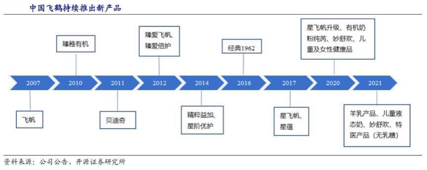 經典案例:根據公司公告、開源證券研究所等綜合資訊表明,飛鶴持續進行產品升級,如 2015 年上線互聯網專供嬰幼兒奶粉品牌“舒貝諾”、2017 年推出星蘊孕產婦奶粉,產品持續升級態勢明顯。