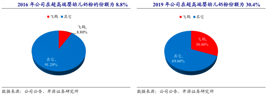 經典案例:根據公司公告、開源證券研究所等綜合資訊表明,飛鶴不斷推出高端、超高端新品,2016年公司在國內超高端嬰幼兒配方奶粉行業上僅有 8.8%的 市場份額,2019 年增至30.4%,目前已經成為全國超高端嬰幼兒奶粉第一品牌。