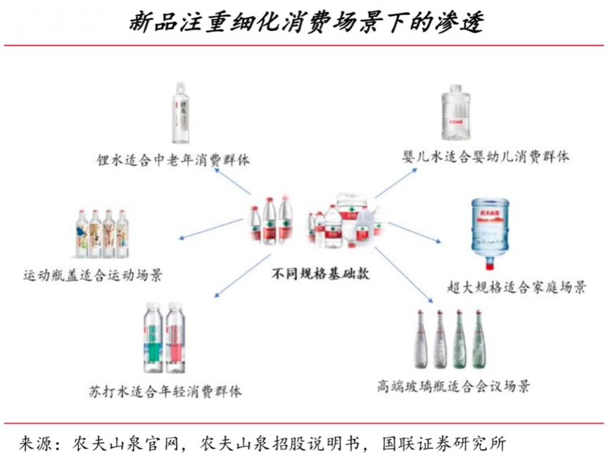 經(jīng)典案例:根據(jù)農(nóng)夫山泉官網(wǎng)、農(nóng)夫山泉招股說(shuō)明書、國(guó)聯(lián)證券研究所等綜合資訊表明,農(nóng)夫山泉推出了針對(duì)不同消費(fèi)場(chǎng)景下的飲用水細(xì)分產(chǎn)品,如針對(duì)高端消費(fèi)者的天然礦泉水和玻璃瓶裝的充氣礦泉水,針對(duì)嬰幼兒的飲用水,能單手打開的運(yùn)動(dòng)瓶蓋礦泉水以及適合中老年人的鋰水等。切入家庭、 辦公、會(huì)議、運(yùn)動(dòng)等細(xì)分領(lǐng)域幫助農(nóng)夫山泉擺脫瓶頸期,提升產(chǎn)品滲透力。