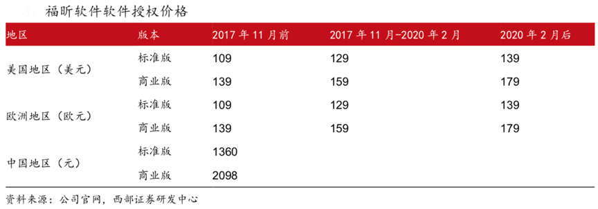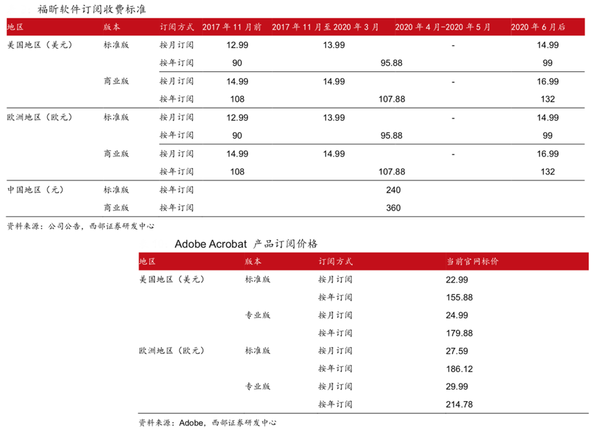 經(jīng)典案例:根據(jù)公司官網(wǎng)、Adobe、西部證券研究中心等綜合資訊表明,福昕軟件公司 Phantom PDF 10 訂閱服務(wù)按年訂閱模式下,海外主要市場(chǎng)全年費(fèi)用標(biāo)價(jià)約 132 美元或歐元,相比 Adobe 同類型產(chǎn)品 Acrobat DC 的定價(jià)低約 26-46%,在功能性能基本 相當(dāng)?shù)那疤嵯拢洚a(chǎn)品服務(wù)具有更高的性價(jià)比。