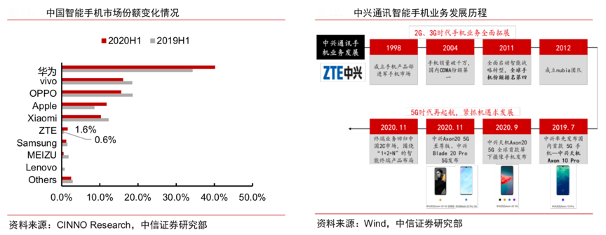 經典案例:根據CINNO Research、wind、中信證券研究部等綜合資訊表明,2020H1,中興通訊在中國智能手機市場的市占率提升至 1.6%(2019H1 為 0.6%),11 月,中興通訊在終端渠 道合作伙伴大會上表示:2021 年,中興通訊終端業務將全面回歸中國 2C 市場,打造“1+2+N” 的智能終端產品布局:以手機核心產品為入口,圍繞個人數據和家庭數據 2 大方向,配合智能穿戴等生活周邊產品,致力于打造科技、品質、年輕的終端品牌形象。