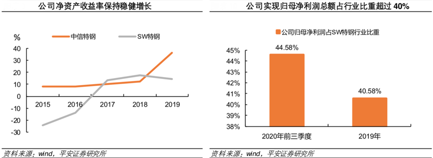 經(jīng)典案例:根據(jù)wind、平安證券研究所等綜合資訊表明,中信特鋼盈利能力強(qiáng)大,2015年以來盈利能力一直保持穩(wěn)健增長(zhǎng)。2019 年公司資產(chǎn)重組實(shí)現(xiàn)整體上市后,公司盈利絕對(duì)額占 SW 特鋼 14 家上市公司盈利總額比重超過40%,盈利規(guī)模位居行業(yè)之首。